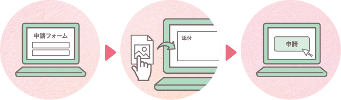 当ホームページ内にある申請フォームに必要事項を入力したうえで、下記の添付書類❶〜❺の写真データまたはスキャンデータを登録(アップロード)してください。詳しくはこちら